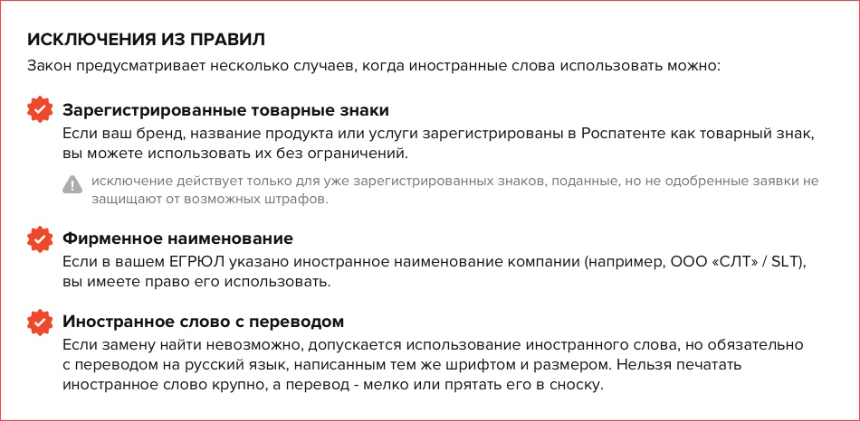 Если названия ваших продуктов или услуг содержат иностранные слова, зарегистрируйте их как товарные знаки. Это важно сделать сейчас - возможно, в будущем регистрация иностранных наименований будет ограничена. Кроме того, это защитит вас от конкурентов и патентных троллей.